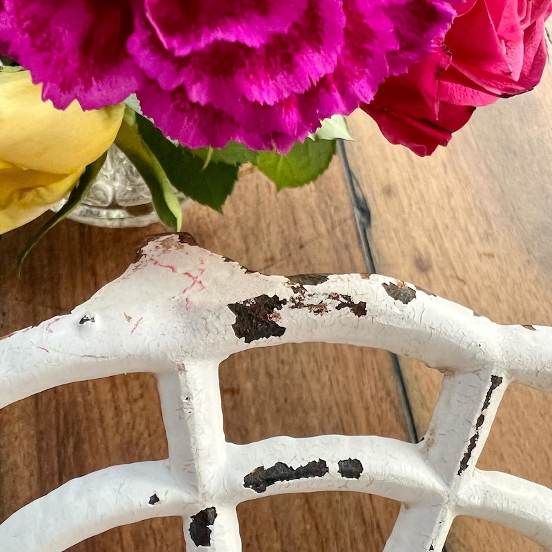 En ce jour de reprise glacial où une fine couche de neige recouvre nos paysages de montagnes, je me suis dis que ce monsieur de blanc vêtu serait la chinerie du jour. Ce très grand dessous de plat en fonte blanc surmonté d’une accroche a une taille idéale pour accueillir vos grosses cocottes. Ce modèle en toile d’araignée permettra de poser vos plats tout droit sorti du four tout en apportant une touche déco.