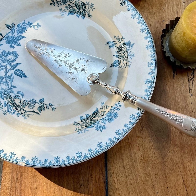 Fût un temps que les moins de 20 ans… tu as la ref? Quand je vois le travail délicat que les orfèvres du 19ème et début 20ème pouvaient produire, j’en reste sans voix. Regardes cette superbe pelle à tarte ou à gâteau en métal argenté finement sculptée. Son délicat motif de liseron en fleurs sur la partie pelle associé à un manche sculpté d’une fleurs montante à petites cloches nous emmènent dans une contemplation bucolique. J’imagine nos grand mères voir arrière grand mères servir aux petits enfants gourmands une part de galette des rois.