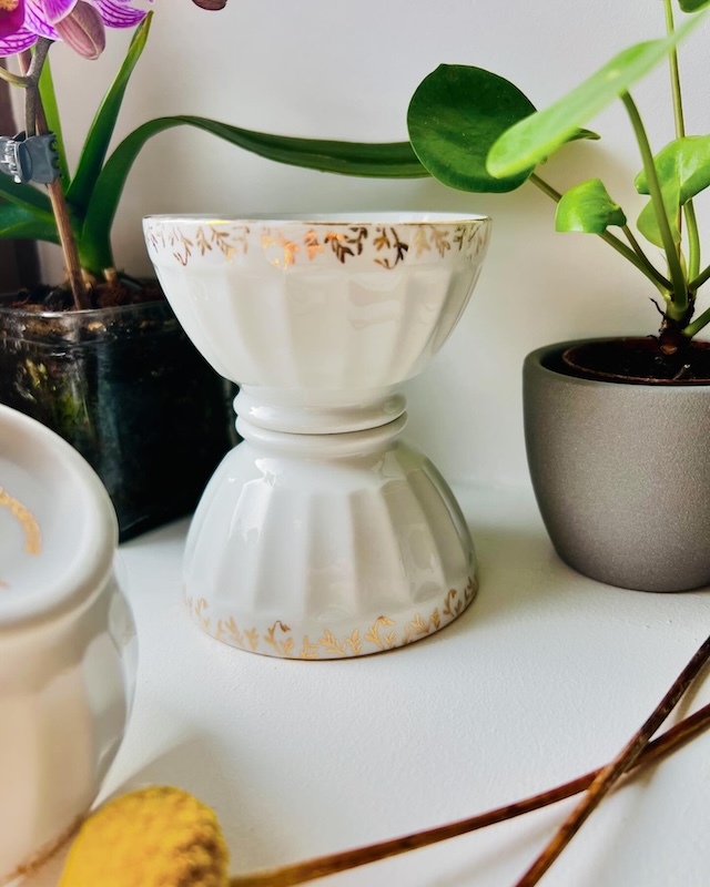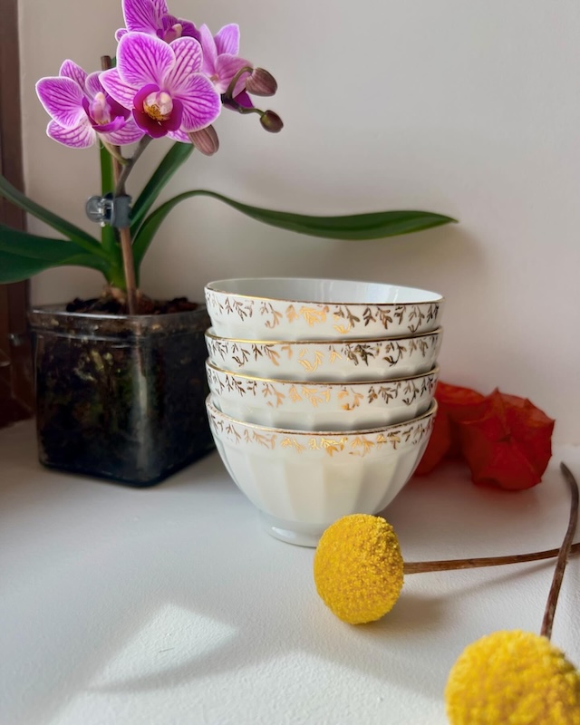 Charmante série de 4 mini bols côtelés sur piedouche ou bols à espresso en porcelaine blanche avec une jolie frise dorée. Ils sont issus de la faïencerie de Longchamp et peuvent être utilisés pour savourer un bon Espresso ou à détourner pour des sauces pour la fondue bourguignonne ou à dips à l’apéro. On aime leur élégance en toute simplicité.